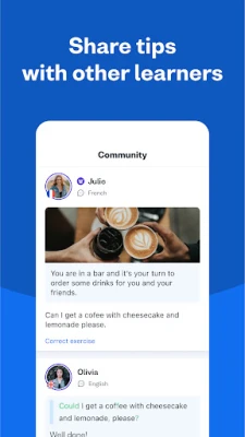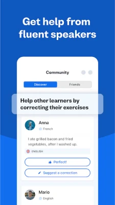 প্রথম দিন থেকেই আত্মবিশ্বাস নিয়ে স্প্যানিশ শিখুন। আমাদের অনলাইন কমিউনিটিতে যোগ দিন এবং সাবলীল ভাষাভাষীদের কাছ থেকে অনুশীলন ও শব্দভান্ডারের উপর মতামত পান। স্প্যানিশ ক্রিয়া থেকে উচ্চারণ পর্যন্ত, কী আরও অনুশীলন প্রয়োজন তা সহজেই দেখুন এবং দ্রুত স্প্যানিশ সহ অন্যান্য ভাষা শিখুন।
