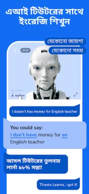 "ইংরেজি বলুন ও শিখুন:লার্না এআই" আপনাকে আত্মবিশ্বাসের সাথে ইংরেজি বলতে শেখায়। ব্যাকরণ, উচ্চারণ, শব্দভাণ্ডার ও কথোপকথনের সর্বাঙ্গীণ অনুশীলনে আপনার ইংরেজি দক্ষতা উন্নত করুন। Learna AI-এর ইন্টারেক্টিভ ও ব্যক্তিগতকৃত পদ্ধতির মাধ্যমে মজাদার উপায়ে ইংরেজি শিখুন। রিয়েল-টাইম ফিডব্যাক আপনার উন্নতিতে সহায়তা করে।